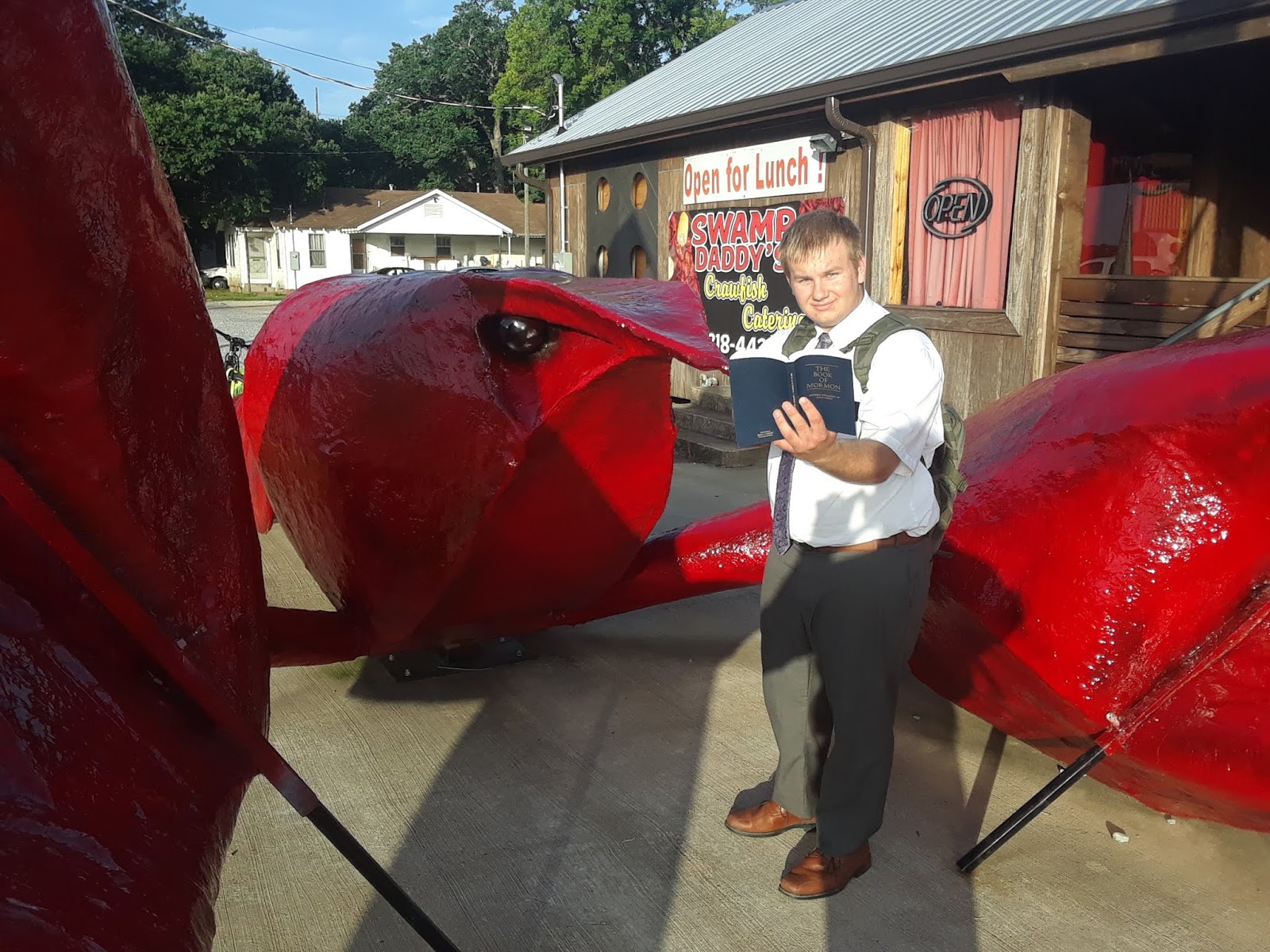 Elder Haney was transferred to Natchez, so still in our district, but two hours away. Before he left, he sent me this picture of him preaching the gospel in the clutches of a giant crawfish at Swamp Daddy's restaurant. The missionaries work so hard, but they have fun, too!